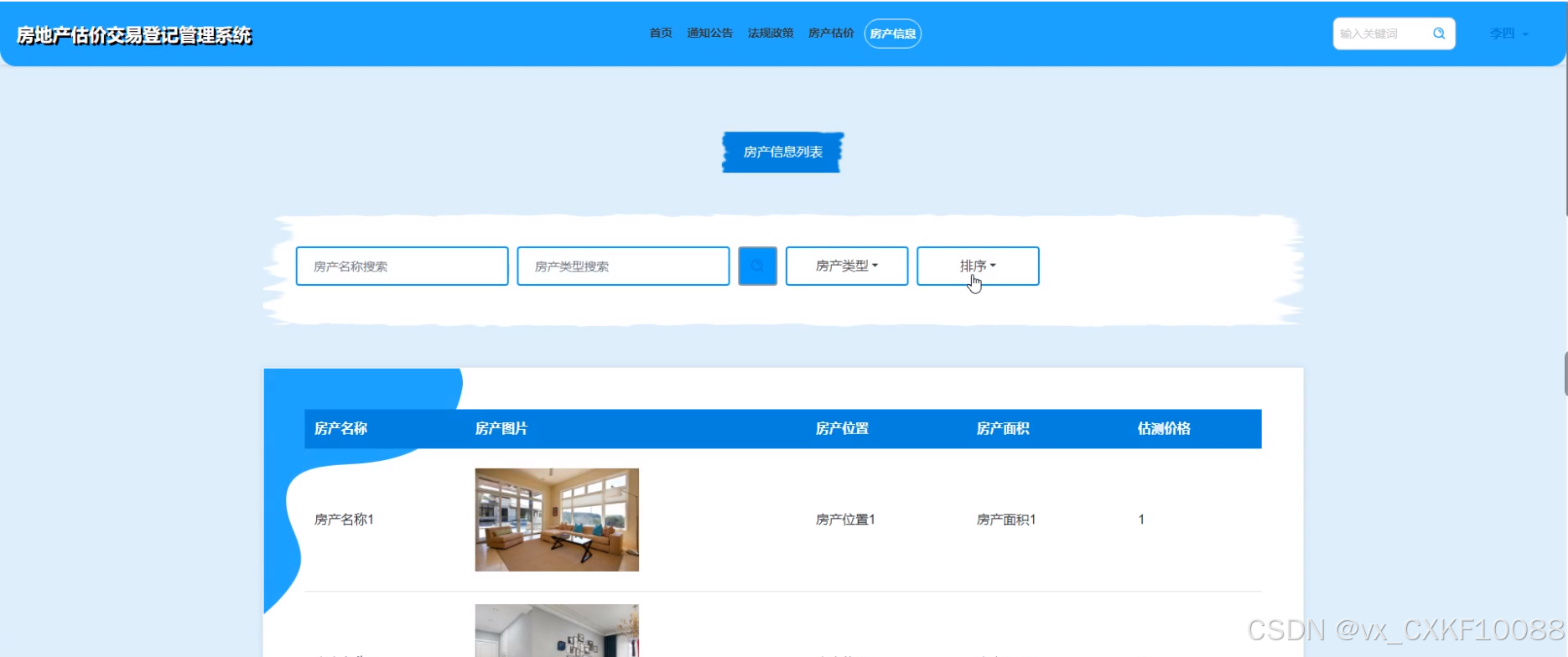 | 查看房产信息测试 | 登录系统 进入房产信息页面 使用搜索栏输入关键词搜索房产信息信息,可以搜索相关房产信息 | 无 | 符合预期 |