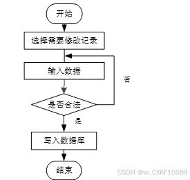 用户首先选择需要修改的记录,输入修改后的数据,系统判断输入数据是否合法。若数据不合法,提示重新输入;若数据合法,则将修改后的数据写入数据库,完成操作后流程结束。修改信息流程图如图3-8所示。