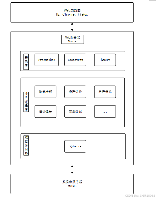 系统由表现层、业务逻辑层、数据访问层和数据库服务器组成。表现层通过浏览器(如IE、Chrome、Firefox)与用户交互,采用FreeMarker、Bootstrap、jQuery等技术实现界面呈现。业务逻辑层负责处理系统的核心业务逻辑,通过分模块设计实现功能分离。数据访问层使用MyBatis框架连接数据库,执行数据的增删改查操作。数据库服务器采用MySQL进行数据存储和管理,为系统提供稳定的数据库支持。整个架构通过Tomcat服务器完成用户请求的接收和处理,确保系统的高效运行[8]。整个系统架构如图4-1所示。