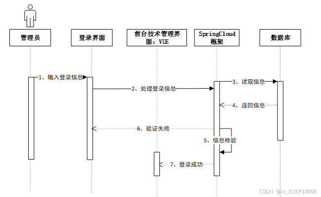 管理员输入登录信息后,登录界面将信息传递至前台管理界面,随后通过SpringCloud框架读取数据库中的用户信息并返回。系统验证信息,若验证成功则登录成功,若验证失败则返回错误提示。登录时序图如图4-4所示。