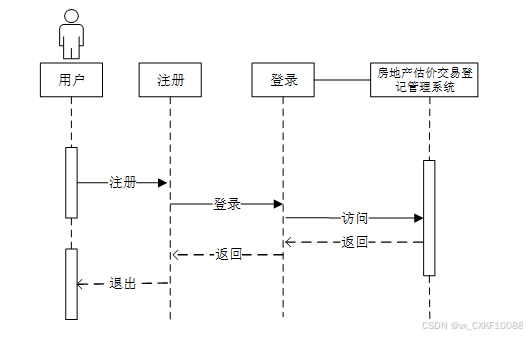 用户通过注册模块发送注册请求,系统完成注册后返回确认信息。随后,用户通过登录模块发送登录请求,系统验证用户信息后允许访问目标系统。用户完成操作后可选择退出,系统终止会话。注册时序图,如图4-3所示。