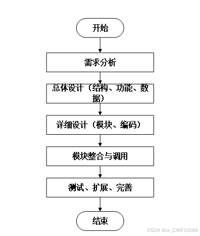 系统开发流程的主要步骤,从需求分析到系统完成的全过程。流程包括需求分析、总体设计(结构、功能、数据)、详细设计(模块、编码)、模块整合与调用,以及测试、扩展和完善,最终完成系统的开发。本系统的开发流程如图3-4所示