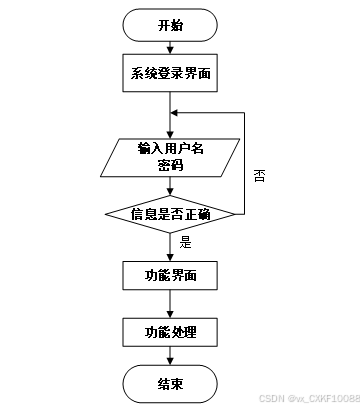 用户首先进入系统登录界面,输入用户名和密码后,系统验证信息是否正确。若验证失败,返回登录界面重新输入;若验证成功,则进入功能界面,执行相应功能处理后结束操作流程。操作流程如图3-6所示。