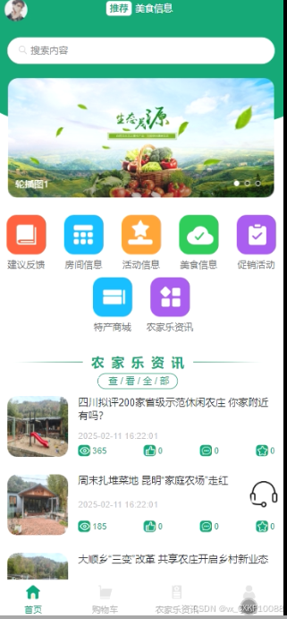 - 首页:展示农家乐的各项服务和功能入口,提供快速导航。