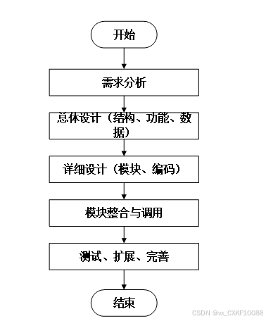 系统开发流程的主要步骤,从需求分析到系统完成的全过程。流程包括需求分析、总体设计(结构、功能、数据)、详细设计(模块、编码)、模块整合与调用,以及测试、扩展和完善,最终完成系统的开发。本系统的开发流程如图3-3所示