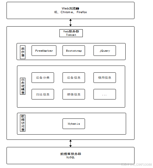 系统由表现层、业务逻辑层、数据访问层和数据库服务器组成。表现层通过浏览器(如IE、Chrome、Firefox)与用户交互,采用FreeMarker、Bootstrap、jQuery等技术实现界面呈现。业务逻辑层负责处理系统的核心业务逻辑,通过分模块设计实现功能分离。数据访问层使用MyBatis框架连接数据库,执行数据的增删改查操作。数据库服务器采用MySQL进行数据存储和管理,为系统提供稳定的数据库支持。整个架构通过Tomcat服务器完成用户请求的接收和处理,确保系统的高效运行[8]。整个系统架构如图4-1所示。