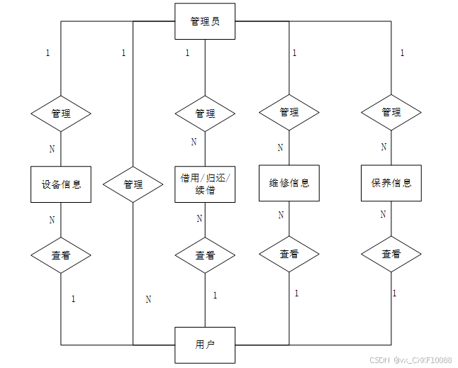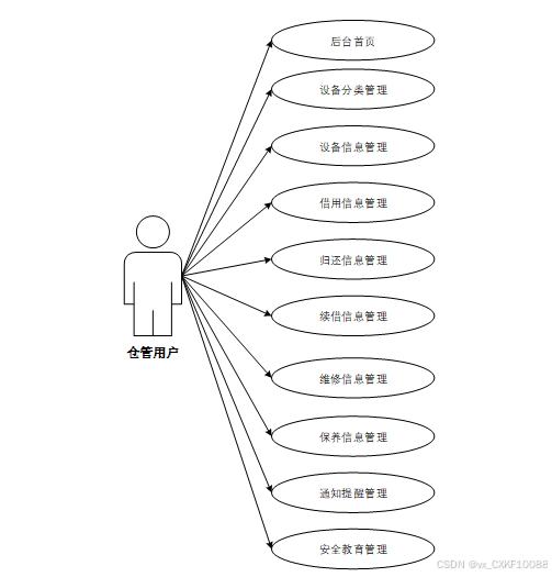仓管用户可查看后台首页、设备分类管理、设备信息管理、借用信息管理、归还信息管理、续借信息管理、维修信息管理、保养信息管理、通知提醒管理、安全教育管理。