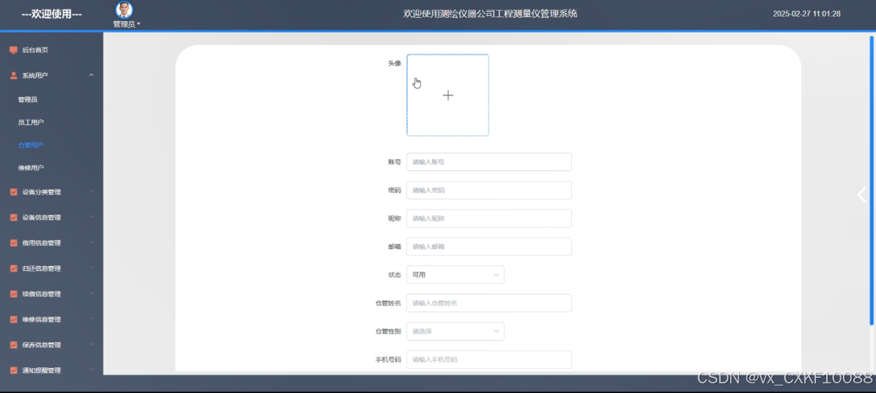 负责管理所有用户的账号信息,包括创建新用户、分配角色权限(如员工用户、仓管用户、维修用户)、重置密码等,确保系统安全及用户管理的有序进行。系统用户界面如图5-8所示。