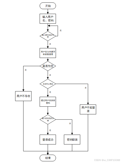 用户输入用户名和密码后,系统先检查输入是否为空,再验证用户名是否存在,若存在则通过用户名获取密码并校验。若密码正确则登录成功,否则提示密码错误。若用户名不存在或无法登录,提示用户操作无效。如图3-4所示。