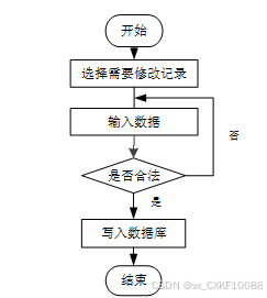 用户首先选择需要修改的记录,输入修改后的数据,系统判断输入数据是否合法。若数据不合法,提示重新输入;若数据合法,则将修改后的数据写入数据库,完成操作后流程结束。修改信息流程图如图3-7所示。