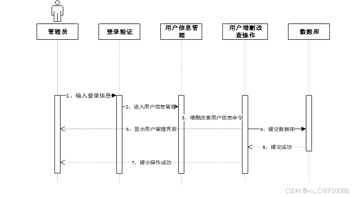 管理员输入登录信息后,进入用户信息管理模块,选择增删改查操作并提交命令至数据库。数据库执行操作后返回成功状态,系统显示用户管理界面并提示操作成功。管理员修改用户信息时序图如图4-4所示。