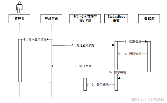 管理员输入登录信息后,登录界面将信息传递至前台管理界面,随后通过SpringBoot框架读取数据库中的用户信息并返回。系统验证信息,若验证成功则登录成功,若验证失败则返回错误提示。登录时序图如图4-3所示。