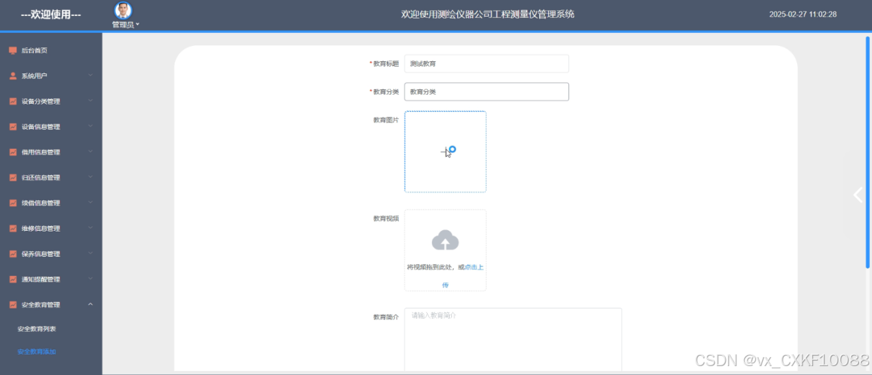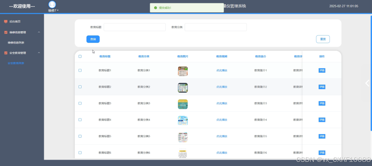 提供维修相关的安全规范和培训资料,维修用户可以查阅最新的安全操作指南,参与必要的安全培训,提升自身及团队的安全意识与技能水平,确保维修工作的安全性与规范性。维修用户安全教育管理界面如图5-7所示。