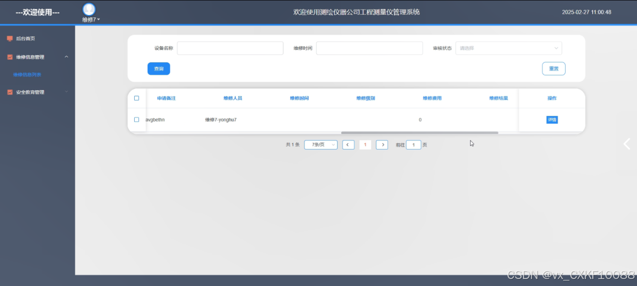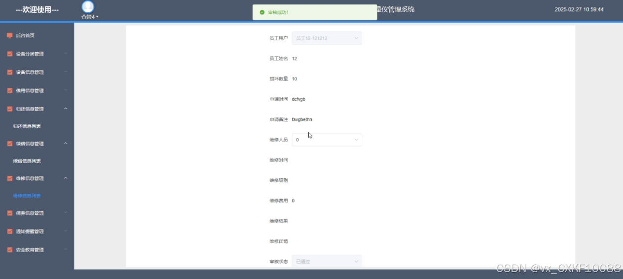 跟踪设备维修进度,确保故障设备及时得到修复,减少对日常工作的影响。仓管用户维修信息管理界面如图5-5所示。