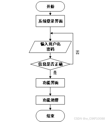 用户首先进入系统登录界面,输入用户名和密码后,系统验证信息是否正确。若验证失败,返回登录界面重新输入;若验证成功,则进入功能界面,执行相应功能处理后结束操作流程。操作流程如图3-5所示。