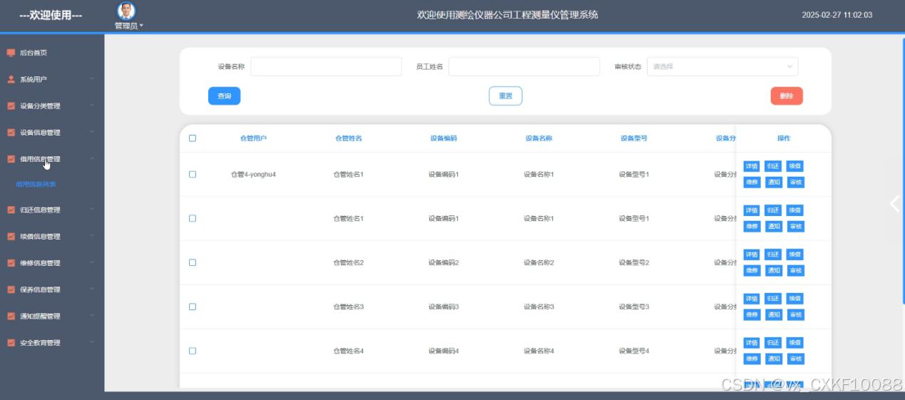 This study designs and implements a surveying instrument management system for a surveying instrument company based on the Spring Boot framework, which uses MySQL as the database solution. The system innovatively combines the management end and the user end into one end, achieving a convenient and efficient unified platform management mode. Administrators are responsible for creating and assigning account passwords for employee users, warehouse users, and maintenance users, ensuring the security and flexibility of the system. The core modules of the system include the backend homepage, system user management, device classification, device information maintenance, borrowing information recording, return information processing, renewal information management, maintenance information tracking, maintenance information updates, notification and reminder services, and the release of safety education materials. Through this comprehensive management system, not only has the equipment management efficiency of the surveying and mapping instrument company been improved, but internal communication and collaboration have also been strengthened, providing strong support for the effective utilization of company resources and safety management. In addition, the design of the system fully considers user experience and operational convenience, enabling users of different roles to efficiently complete their tasks, thereby improving overall work efficiency and service quality..
