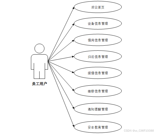 员工用户可查看后台首页、设备信息管理、借用信息管理、归还信息管理、续借信息管理、维修信息管理、通知提醒管理、安全教育管理。