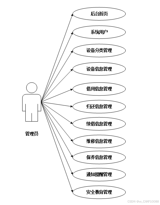 管理员可管理后台首页、系统用户、设备分类、设备信息、借用信息、归还信息、续借信息、维修信息、保养信息、通知提醒、安全教育。