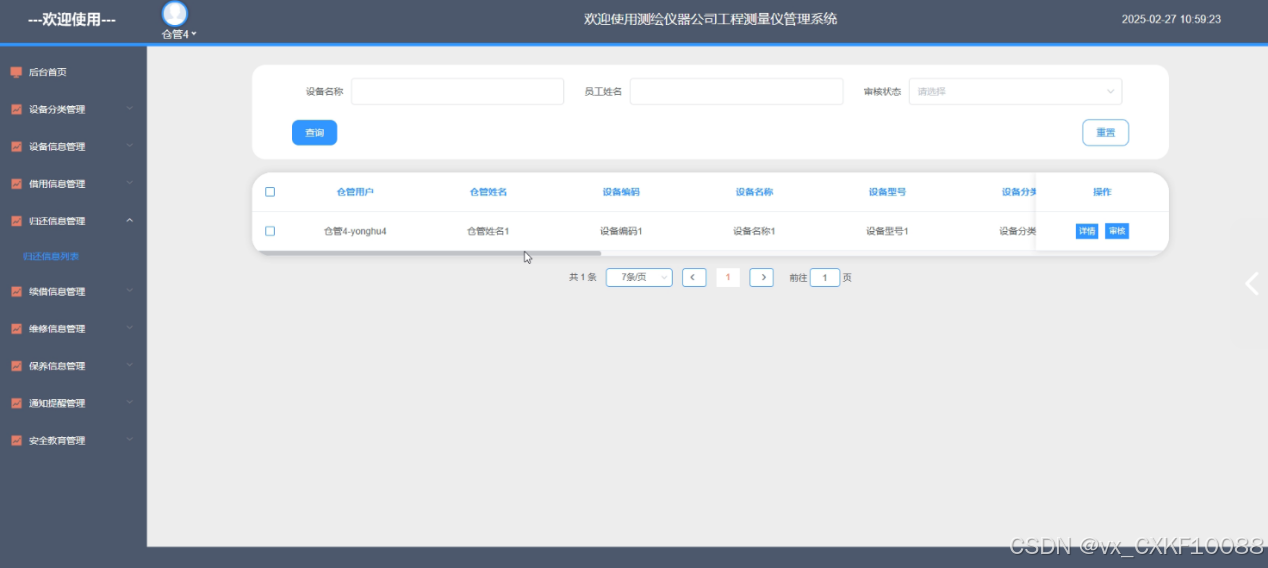 记录并确认设备归还情况,检查设备完好性,维护库存准确性。仓管用户归还信息管理界面如图5-4所示。