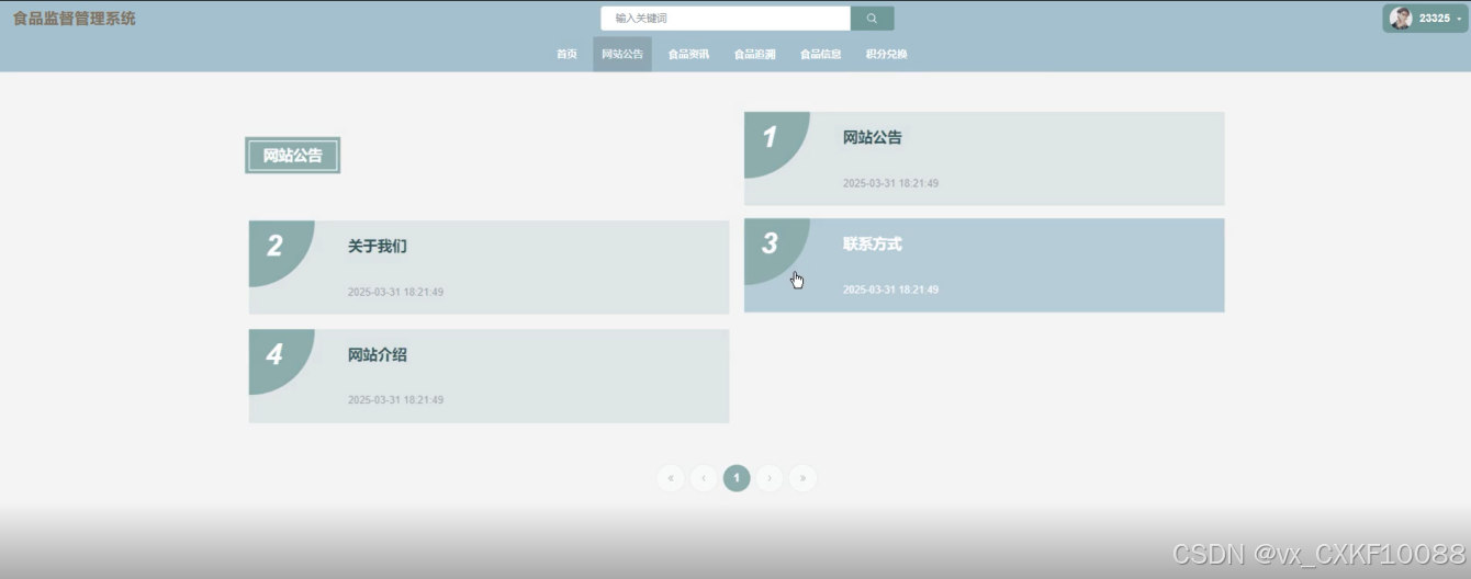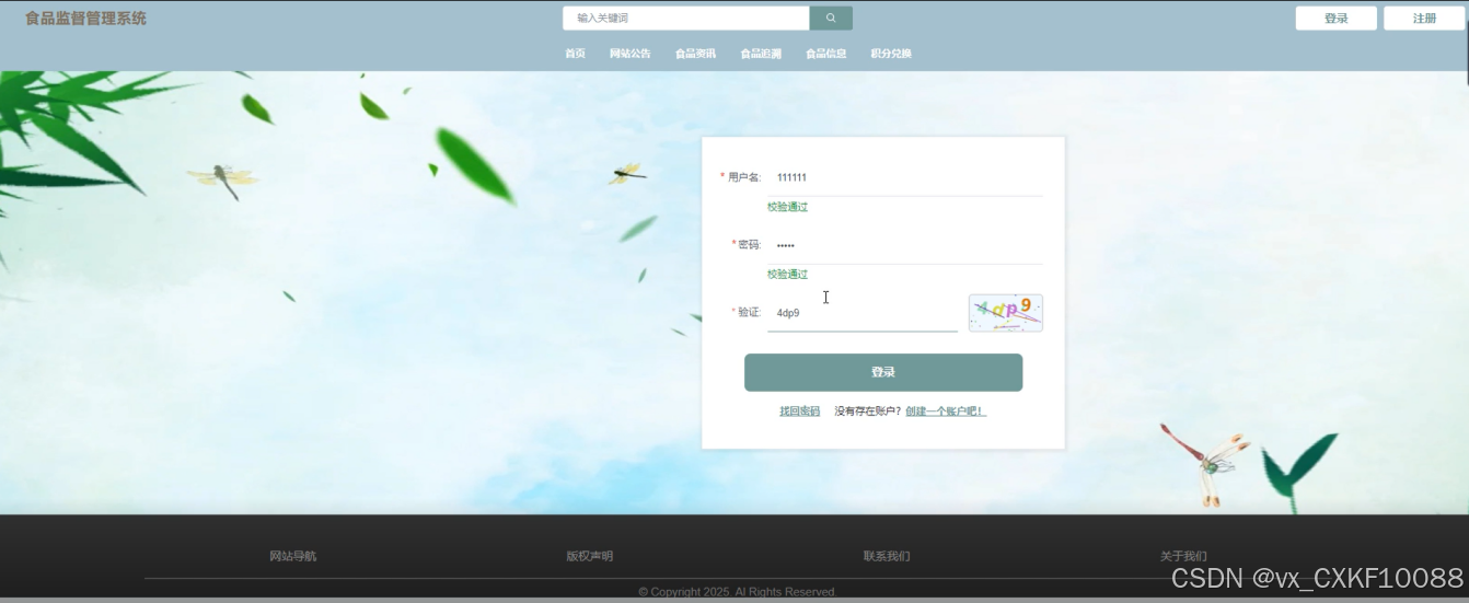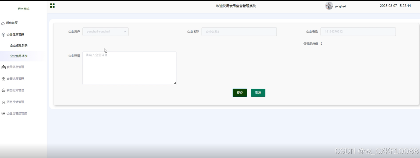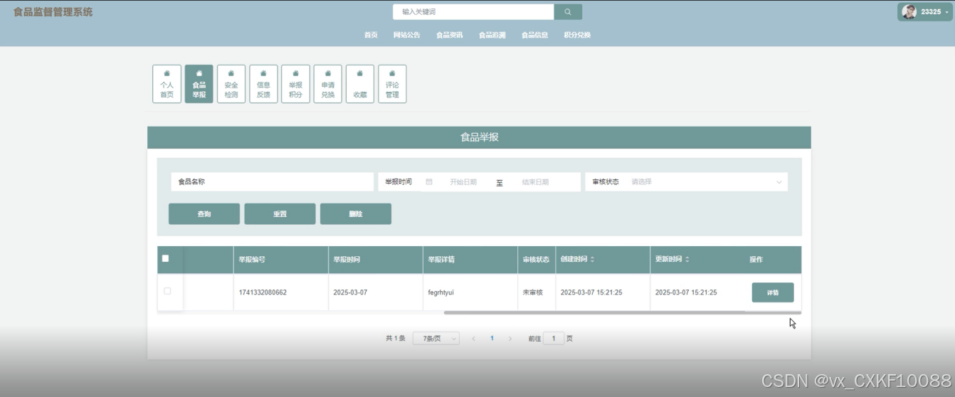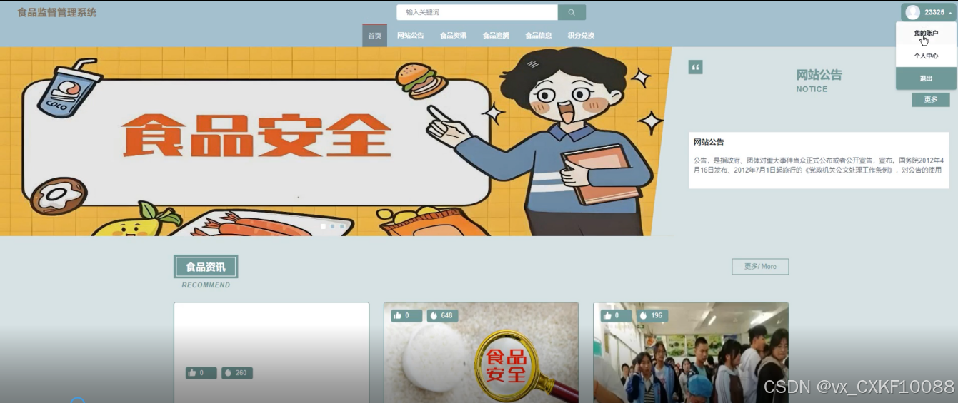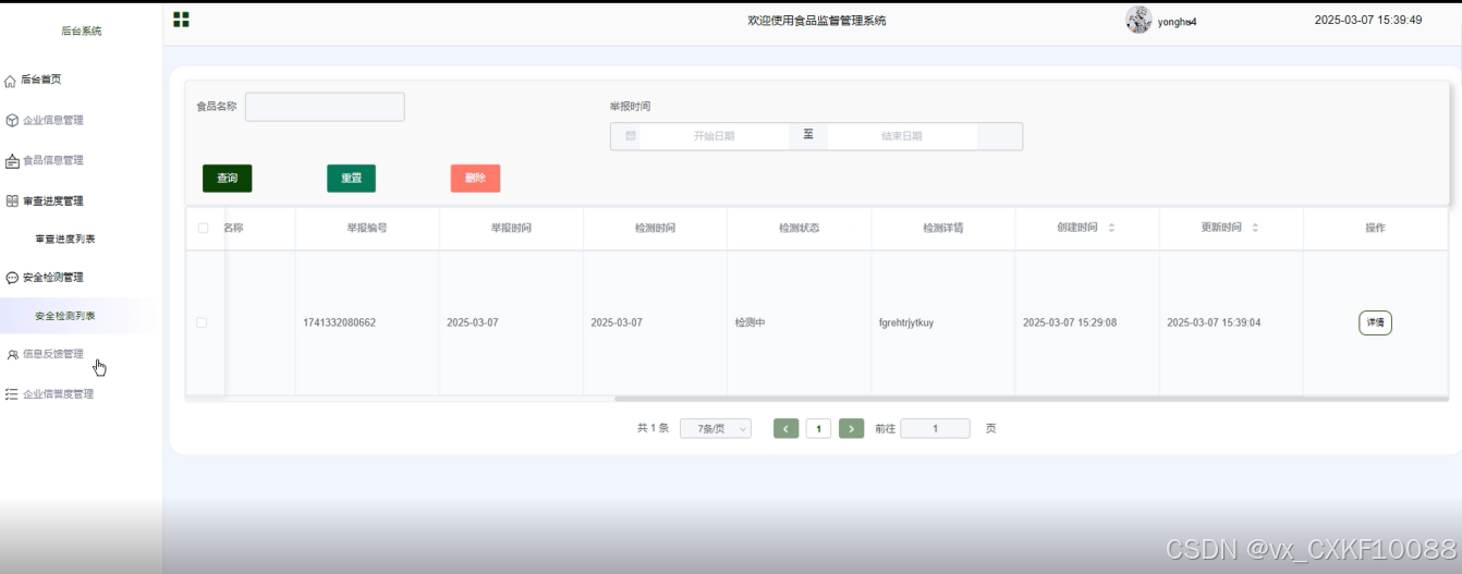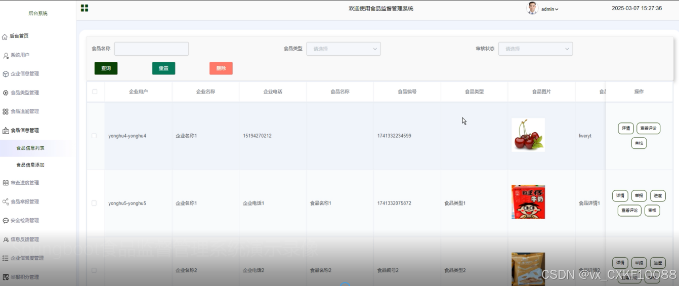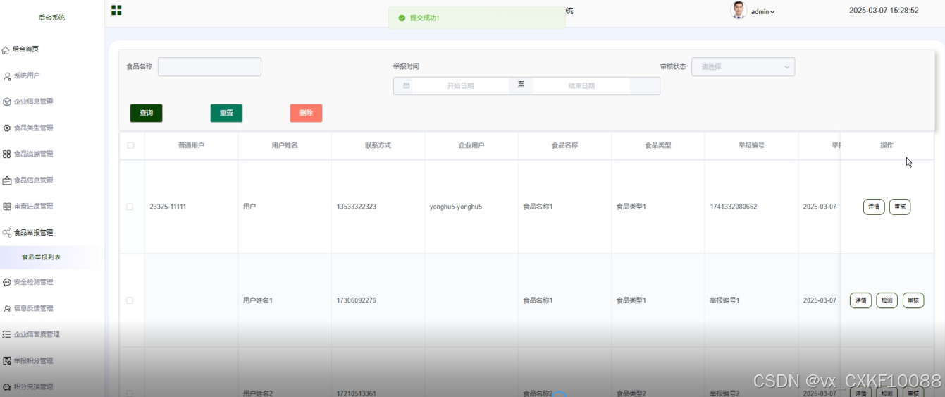 在确定了系统的可行性及具体功能后,我们依据初步设计方案逐步完善各个模块。利用Spring Boot的强大功能,实现了后端服务如后台首页、系统用户、企业信息管理、食品类型管理、食品追溯管理、食品信息管理、审查进度管理、食品举报管理、安全检测管理、信息反馈管理、企业信誉度管理、举报积分管理、积分兑换管理、申请兑换管理、系统管理、网站公告管理、资源管理等功能;而在前端,则借助Spring Boot提供的丰富工具集,开发出一个直观易用的应用界面,支持普通用户的日常操作,如首页、网站公告、食品资讯、食品追溯、食品信息、积分兑换、个人中心(个人首页、食品举报、安全检测、信息反馈、举报积分、申请兑换、收藏、评论管理等)等。整个过程不仅涉及到了前后端的技术整合,还涵盖了用户体验优化等多个方面。