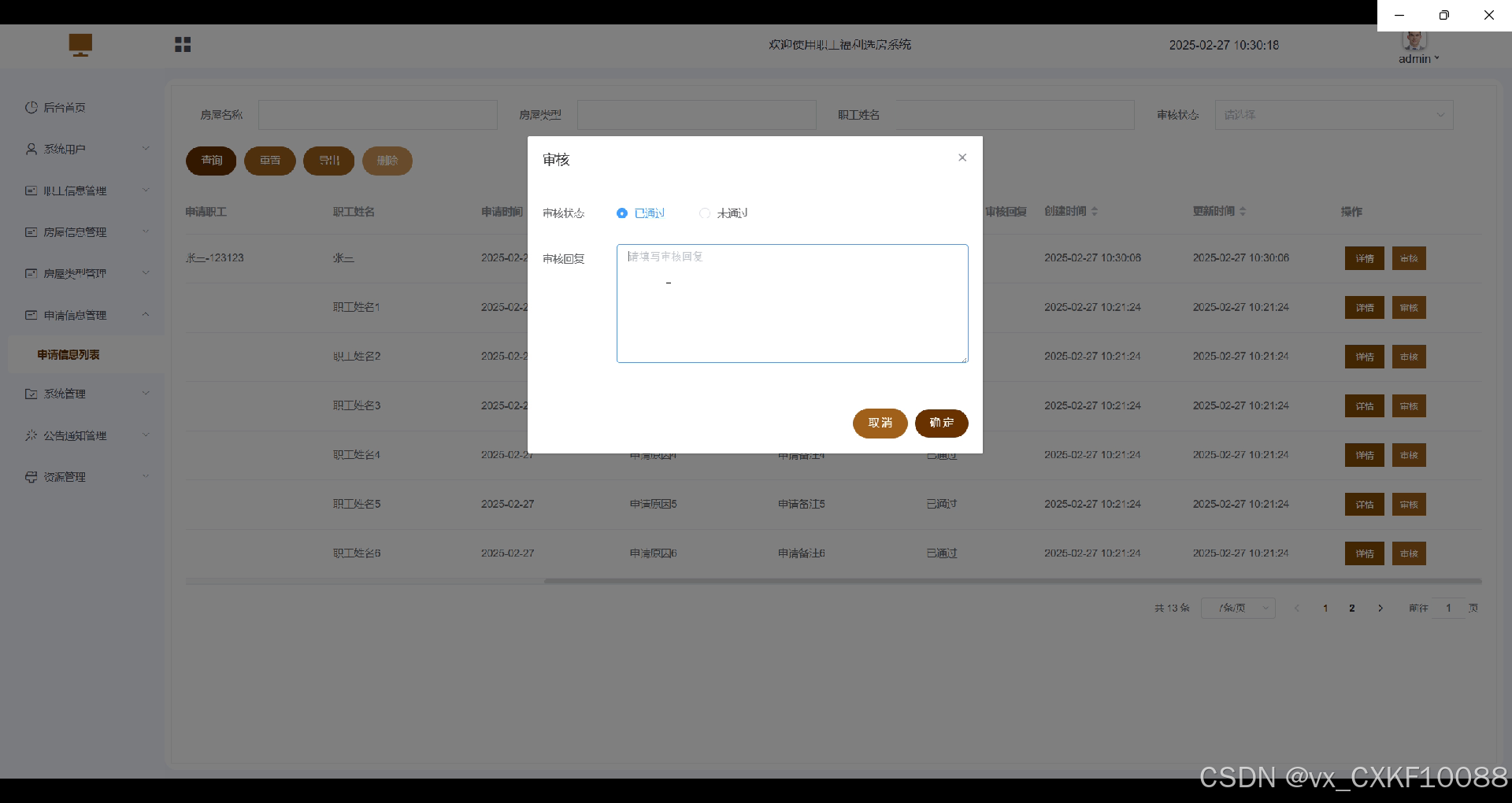 申请信息管理:管理员可以审核职工的房屋申请,查看申请内容并根据公司政策批准或拒绝申请,同时更新申请状态,确保房屋申请流程的顺畅与透明。