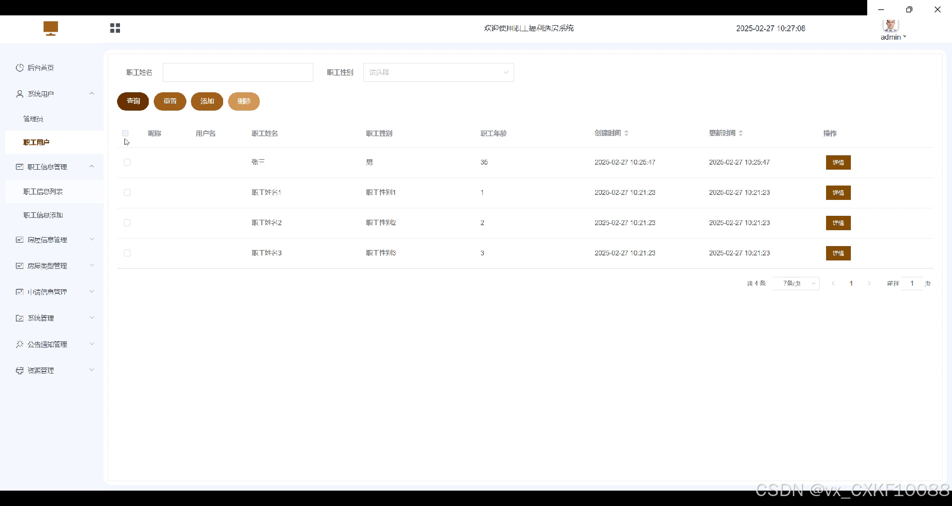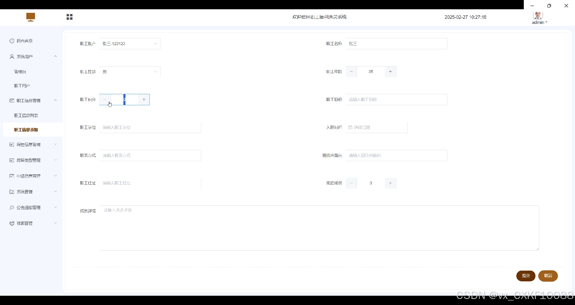 职工信息管理:管理员可以管理职工的详细个人资料,包括职工名称、性别、年龄、积分、职称、学位、入职时间、现住房面积、职工地址、家庭成员等,确保职工档案的及时更新和完整管理。