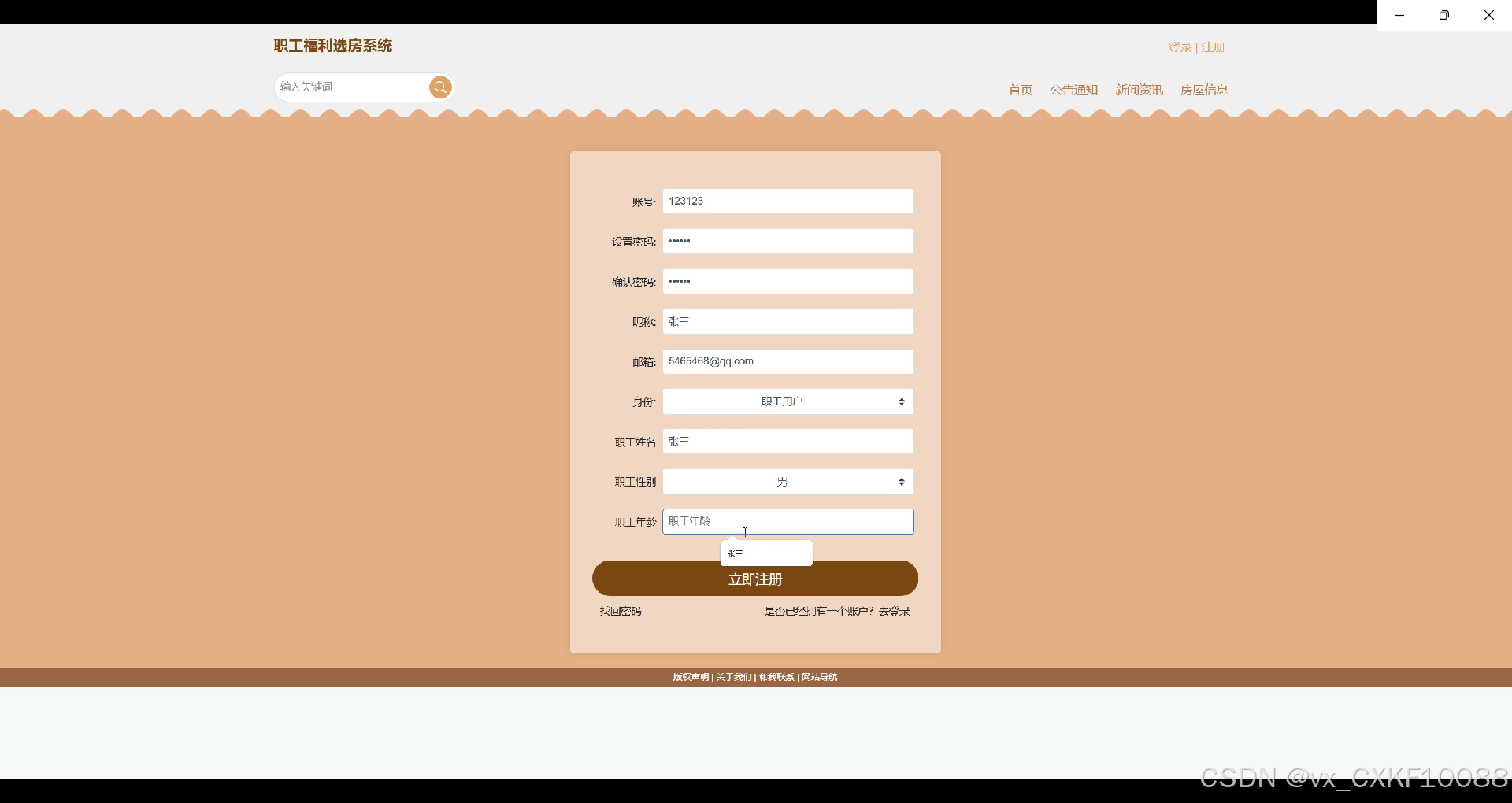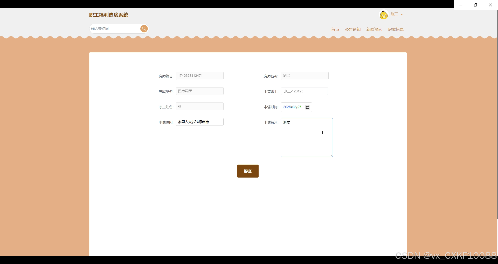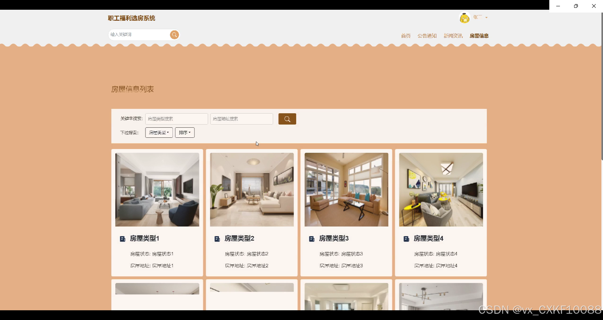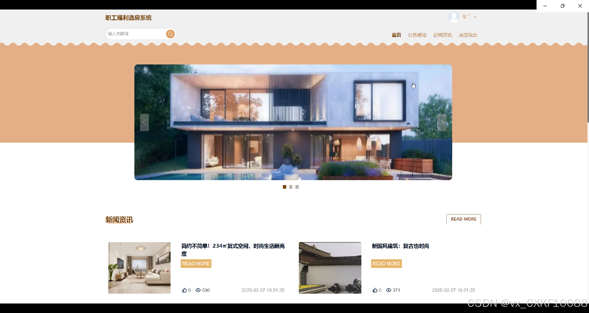 首页:提供职工登录后的主页展示,包含公司公告、最新新闻资讯以及推荐的房屋信息,帮助职工快速了解当前的福利政策和房屋选择。