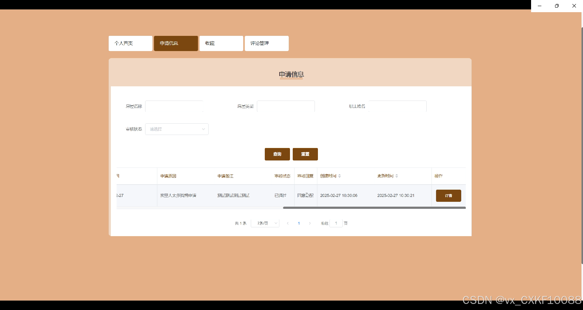 申请信息页面展示职工提交的房屋申请记录,包括每个申请的房屋类型、申请时间、申请状态等。职工可以查看自己申请的房屋是否被批准、当前申请是否处于等待中。若有申请被拒绝,页面将显示具体原因,便于职工了解并重新申请。页面如下图所示。