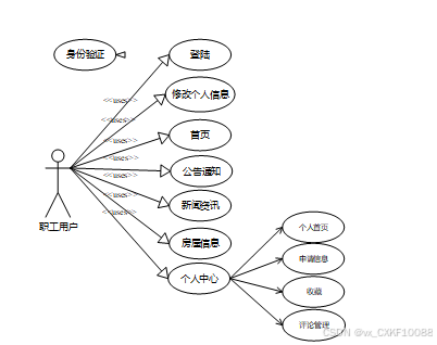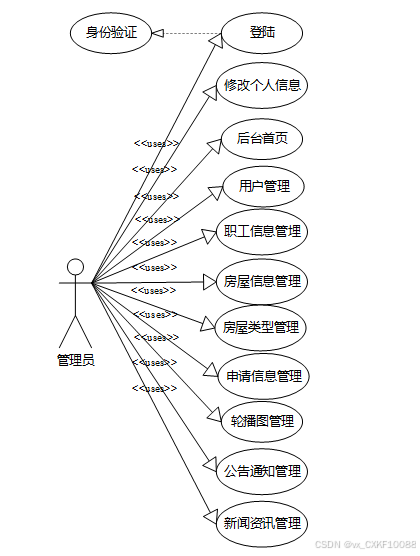 管理员后台功能包含对职工信息、房屋信息和申请记录的全面管理,支持发布公告、更新新闻资讯、管理房屋类型和轮播图。管理员可审核房屋申请、编辑职工资料,确保系统稳定运行与信息准确传递。用例图如下所示: