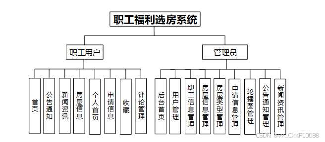 功能模块设计是系统开发过程中的重要阶段,将系统划分为不同的模块,每个模块负责完成特定的功能或任务。职工福利选房系统由多个功能模块组成,每个模块下又包含具体的功能操作。功能模块图如下图所示。