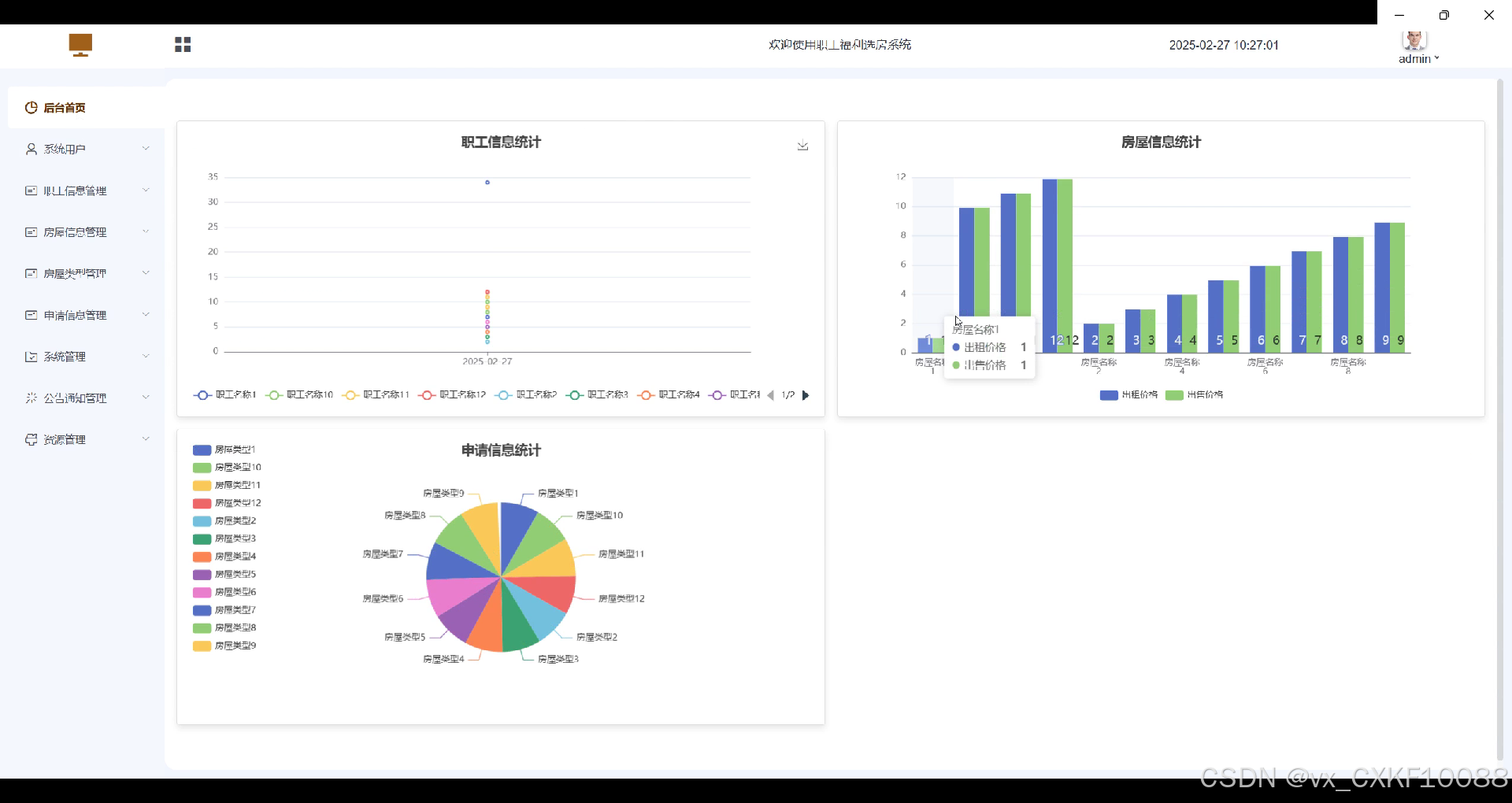 后台首页展示系统的统计信息,管理员可以查看职工信息统计、房屋信息统计、申请信息统计等关键数据。通过可视化图表或表格呈现,方便管理员快速掌握系统的整体情况。页面如下图所示。
