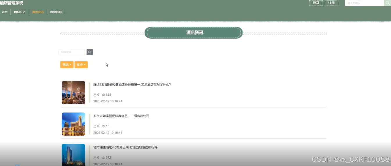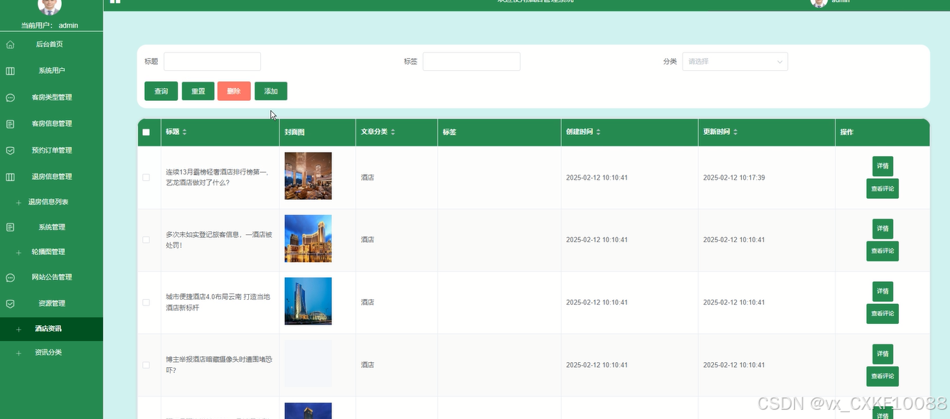 包括酒店资讯的管理,提供查询、重置、删除、添加、详情、查看评论、资讯分类等操作,丰富酒店的在线资讯内容。管理员可以发布酒店的介绍、旅游指南和客户评价,为客户提供全面的酒店信息,提升客户体验。如下图所示。