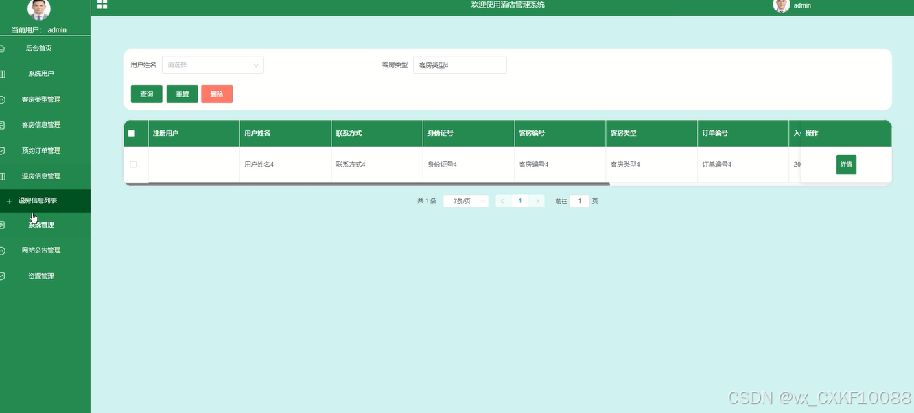 管理退房信息列表,包括查询、重置、删除、详情、评论等操作,为酒店提供详实的客户反馈和退房数据。管理员可以分析退房数据,了解客户满意度,并据此优化服务流程。如下图所示。