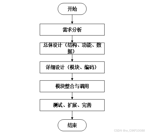 系统开发流程的主要步骤,从需求分析到系统完成的全过程。流程包括需求分析、总体设计(结构、功能、数据)、详细设计(模块、编码)、模块整合与调用,以及测试、扩展和完善,最终完成系统的开发。本系统的开发流程如下图所示