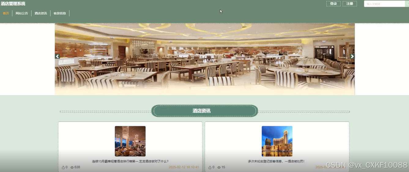 2.首页:用户登录后进入酒店首页,展示酒店的特色房型、优惠活动、最新公告以及其他关键信息,帮助用户快速了解酒店概况。