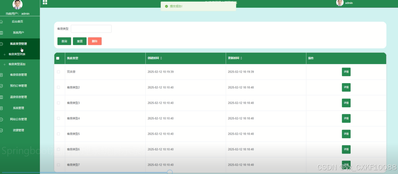 展示预约订单的列表,用户可以查询预约信息、重置、删除、查看预约详情、确认客户入住、进行预约审核以及确认客户退房。这些功能使得房间预定管理更加高效、准确。如下图所示。