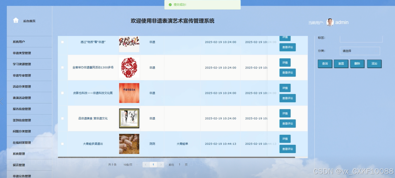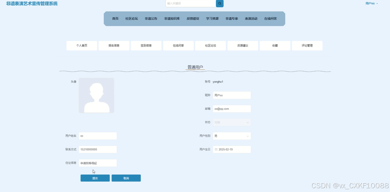 8.表演活动管理:全面管理非遗表演活动的信息,包括添加新活动、编辑已有活动、审核报名信息等。
