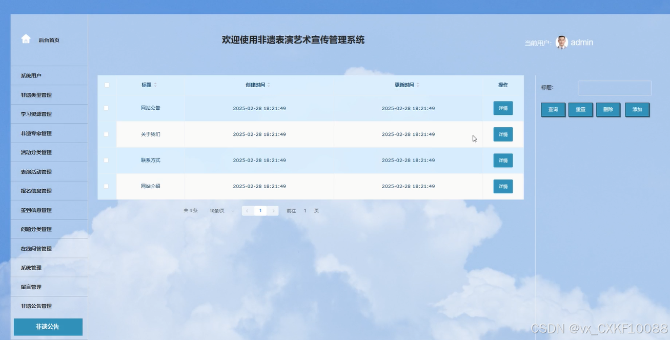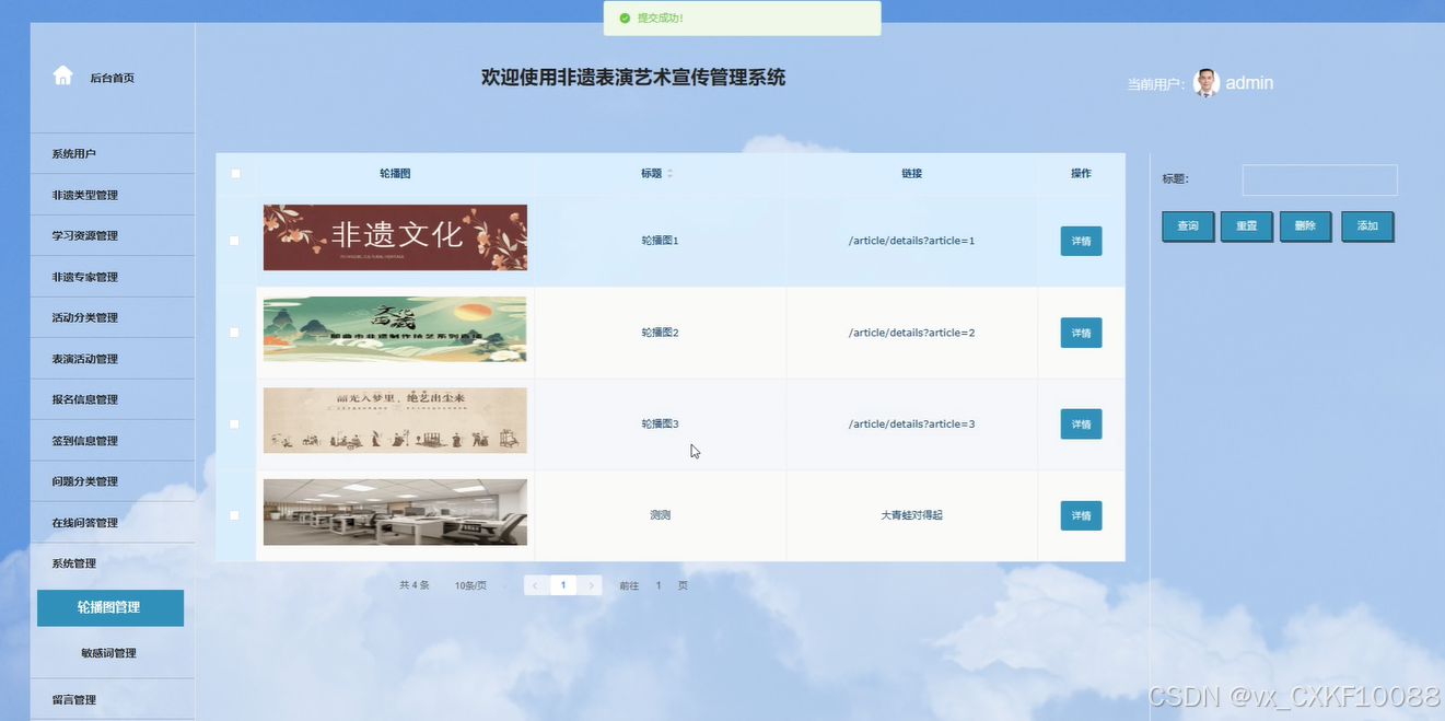 此部分允许管理员管理非遗公告的非遗公告内容,如轮播图的添加、编辑和删除,以及非遗公告管理的更新。非遗公告管理模块如下图所示。