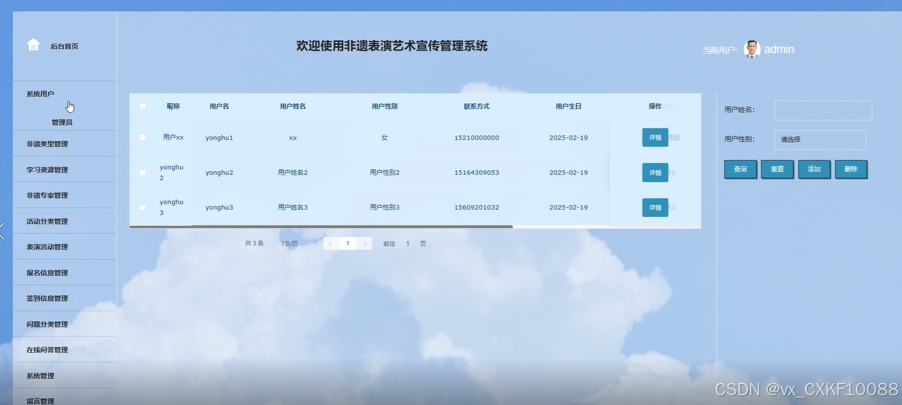 3.系统用户管理:维护和管理系统的用户数据,包括普通用户和管理员账号,支持批量导入导出和权限分配。