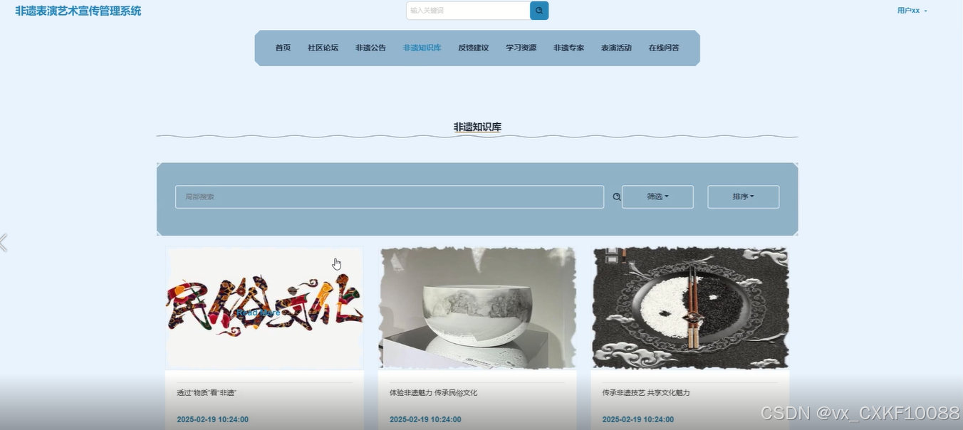 非遗知识库功能包括局部搜索、筛选和排序功能,帮助用户快速查找和浏览感兴趣的内容,提升信息获取的效率和便捷性。非遗知识库界面如图所示。
