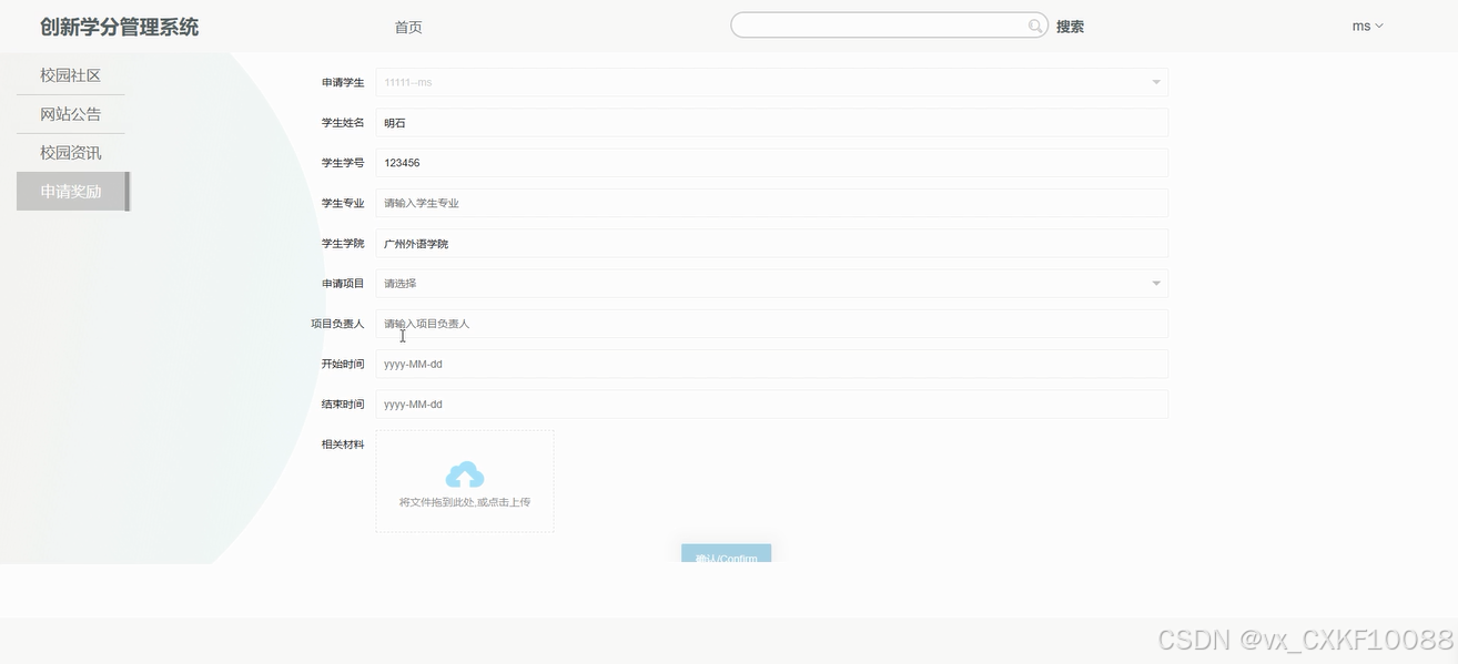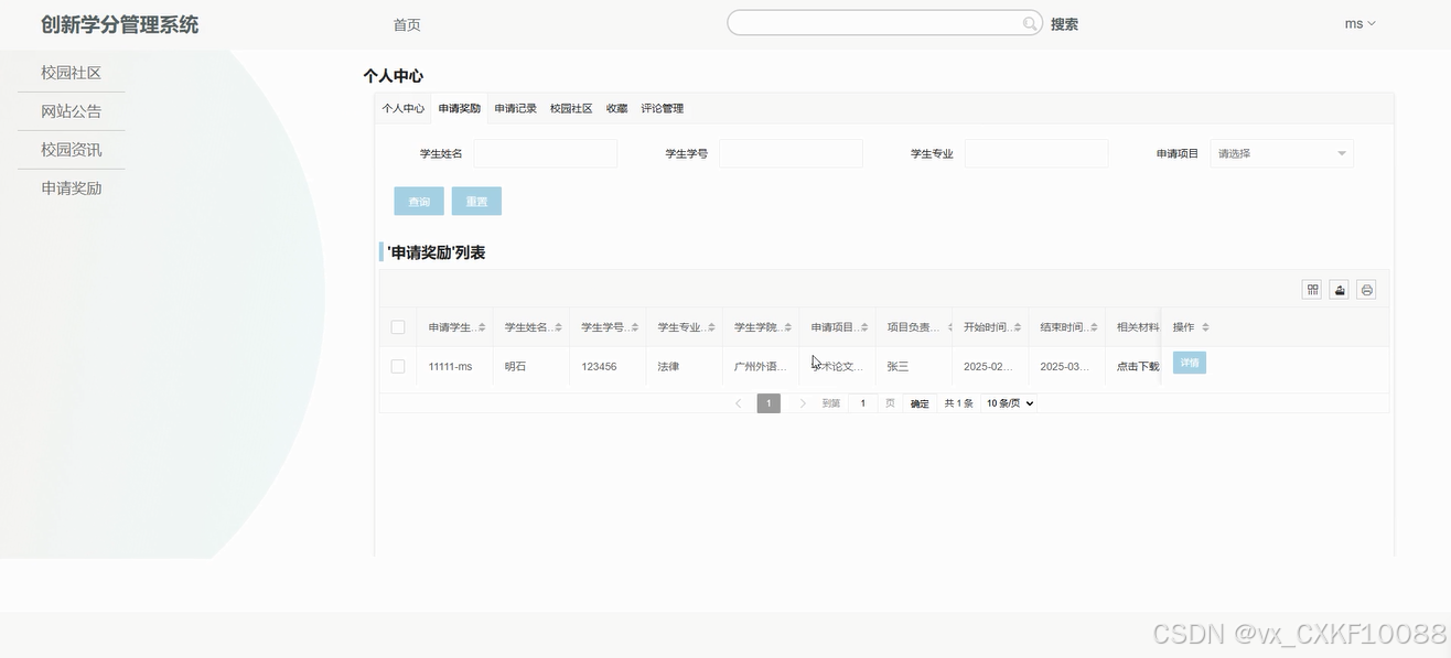 - 申请奖励:学生可以申请学分奖励,填写相关信息并提交申请。奖励的申请可能涉及到参与的学术活动、社团活动等。提交后,学生需要等待管理员的审核。