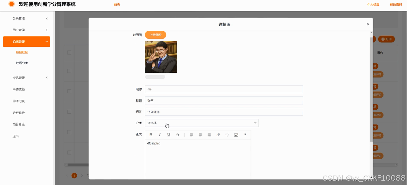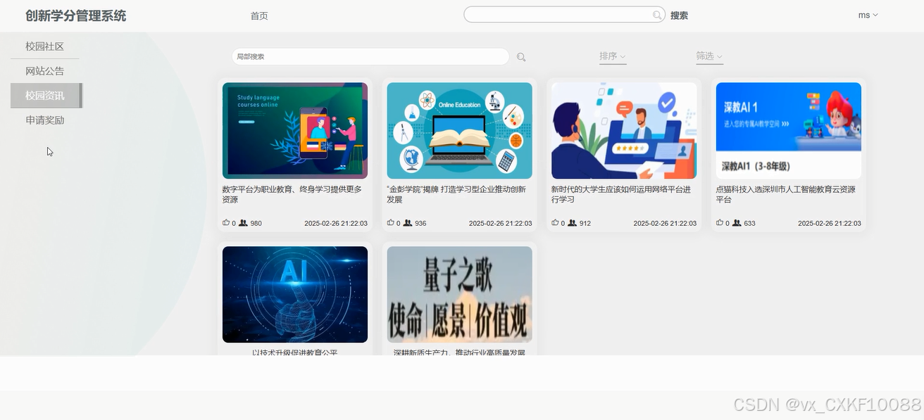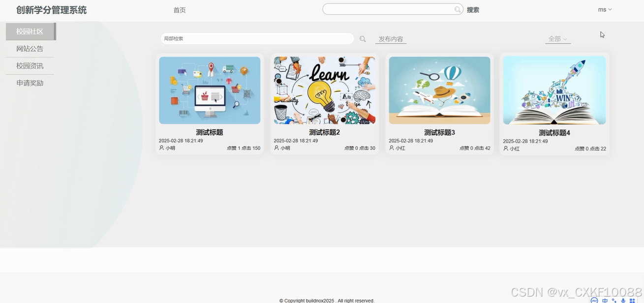 This system is an innovative credit management platform developed based on the SpringBoot framework, aimed at providing schools with an efficient and convenient credit management tool. Through the system, students can manage their personal information, submit and track reward applications, view campus information, and interact with the campus community. The platform ensures that students can easily participate in credit application and management through clear functional zoning, timely access to the latest developments and announcements on campus, and also participate in discussions and exchanges in the campus community.