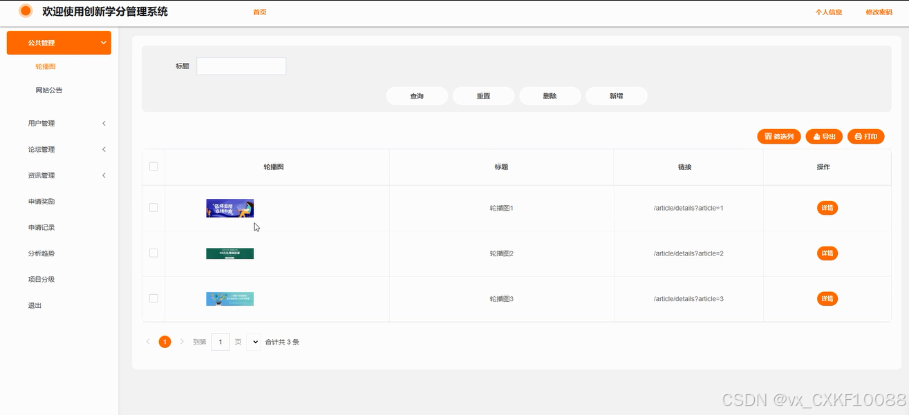 公共管理功能允许管理员管理网站的轮播图和公告,确保学生及时获取最新的活动和通知。管理员可以根据需要新增、修改或删除轮播图和公告,保持信息的实时性和准确性。模块如下图所示。