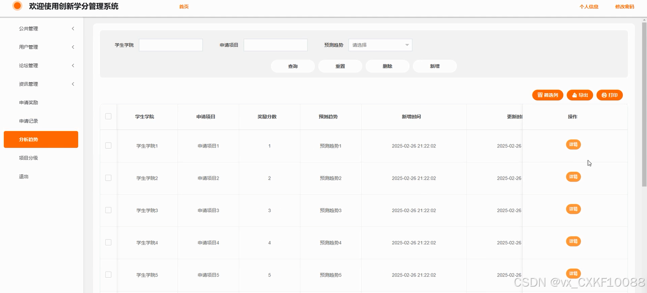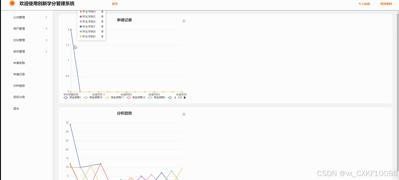 - 分析趋势:管理员可以查看学分申请的趋势分析,如学生参与活动的情况、申请奖励的热度等,从而更好地调整系统运营策略。