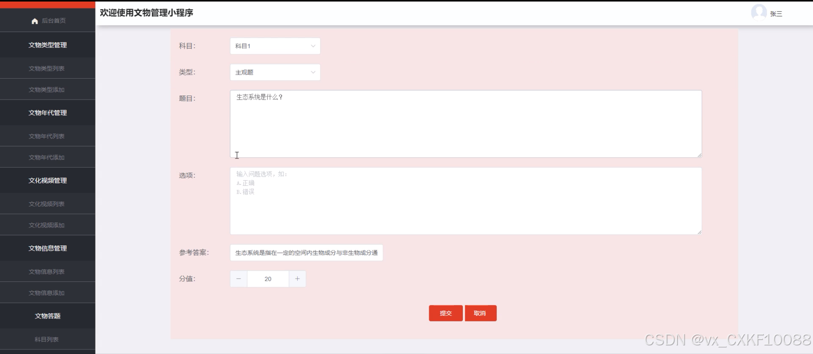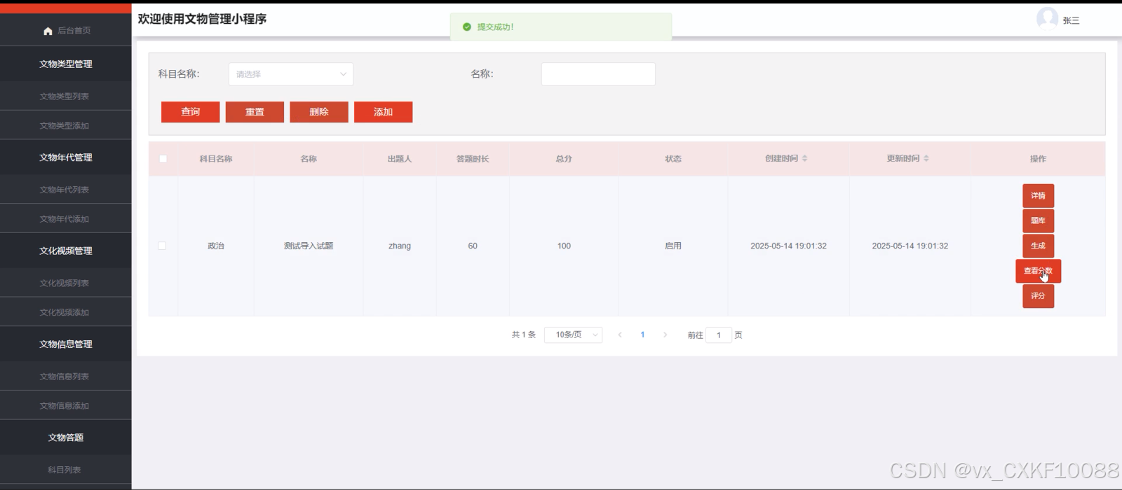 文物答题管理:管理答题模块中的科目、试题库、错题记录和试卷列表,支持题库导入、试卷生成与成绩分析等功能。