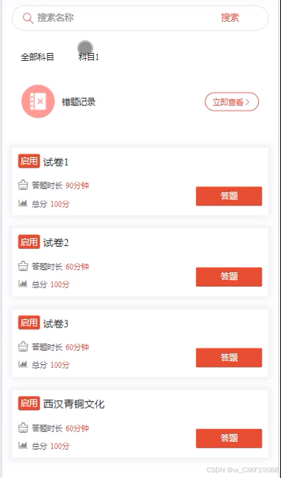 科目列表:对答题模块中的考试科目进行管理,包括新增、删除、修改和查询,满足不同类别知识测试需求。