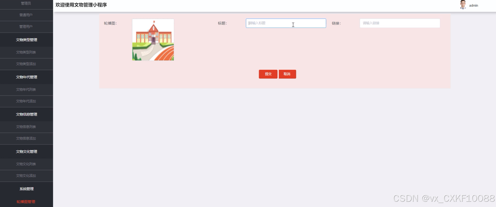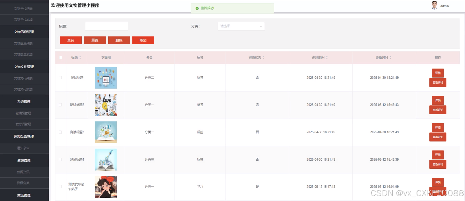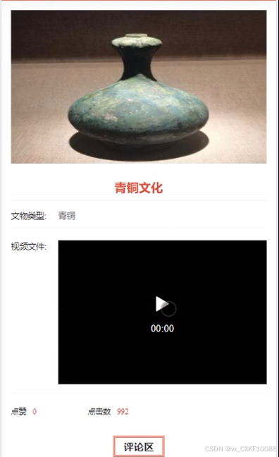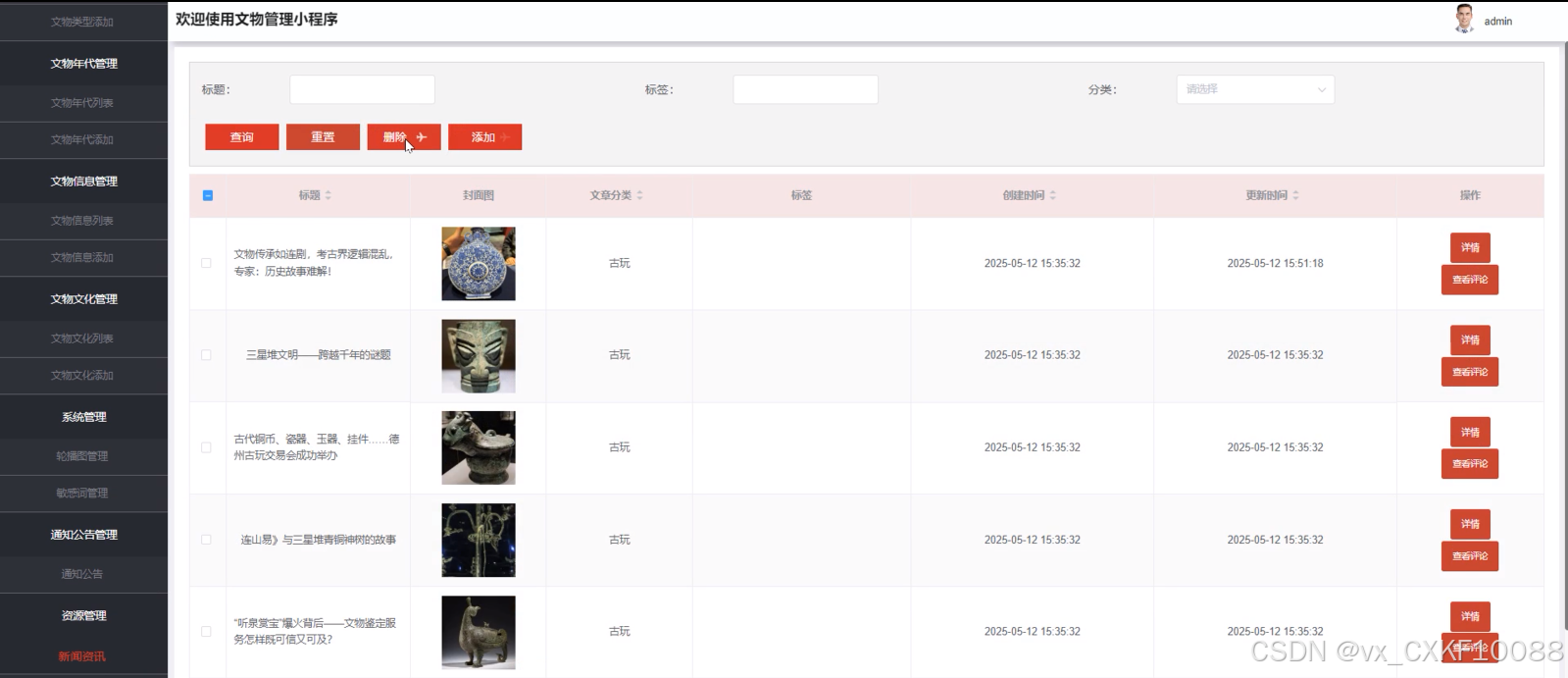 文物信息管理:支持添加、修改、删除文物信息,包括名称、数量、简介、图片及视频上传等功能,并可查看用户评论,实现文物资料的全面管理。