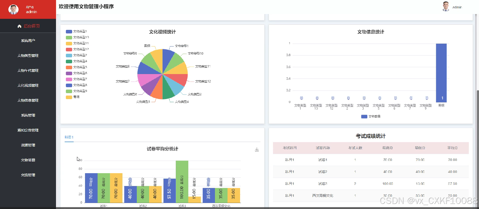 后台首页:展示平台整体运行数据,包括文化视频数量、文物信息总量、考试成绩分布、试卷平均分等统计图表,便于管理员全面掌握系统状态。