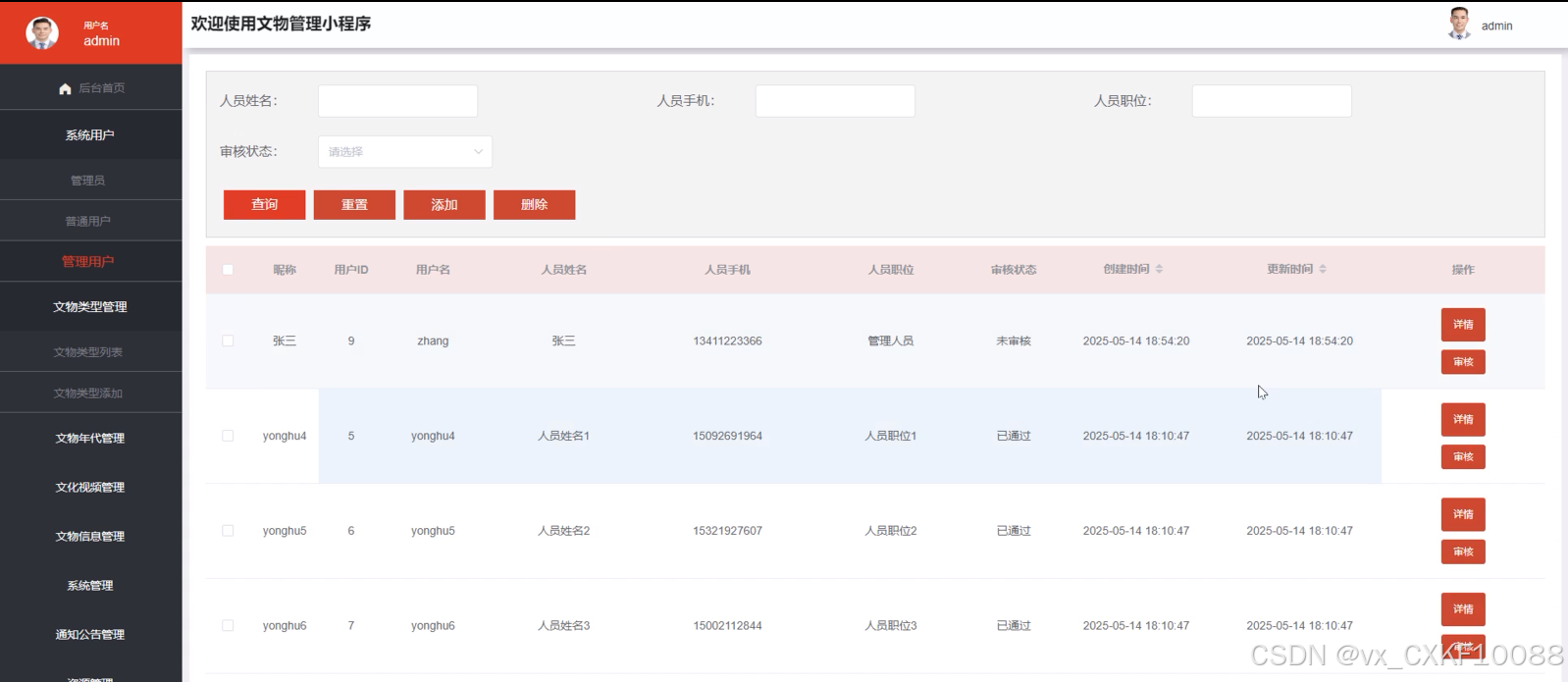 系统用户管理:可查看和管理所有用户(管理员、普通用户、管理用户),审核管理用户的注册申请,分配或禁用用户权限,保障系统安全运行。