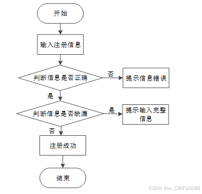 未有账号的用户可进入注册界面进行注册操作,填写注册表格,包括用户名、密码、电子邮件等必要信息。后台系统验证并保存用户提交的信息。分配唯一用户标识符。注册成功后,用户可以使用账号密码进行登录。用户注册流程图如下图所示。
